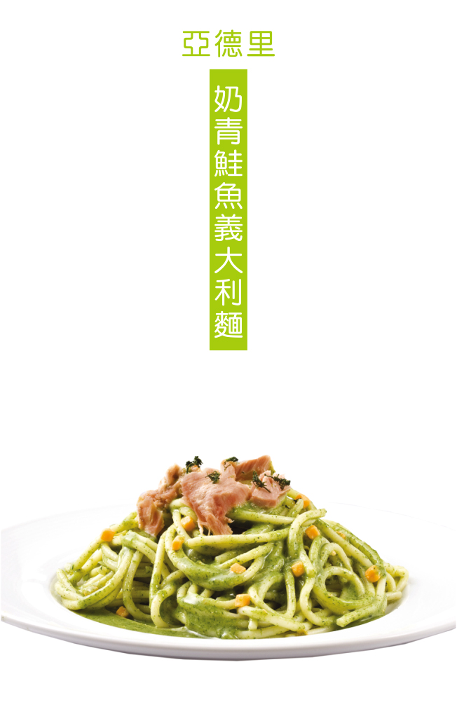產品簡介:讓你感受入口時舌尖傳來小麥的香氣與彈牙口感,搭配鮮配鮭魚肉鮮甜風味及營養成分高的食材加以調和,再搭配與由鮮奶油調味傳說的美味青醬汁,完成一道讓眾多義式料理饕客充滿幸福的義式美食。