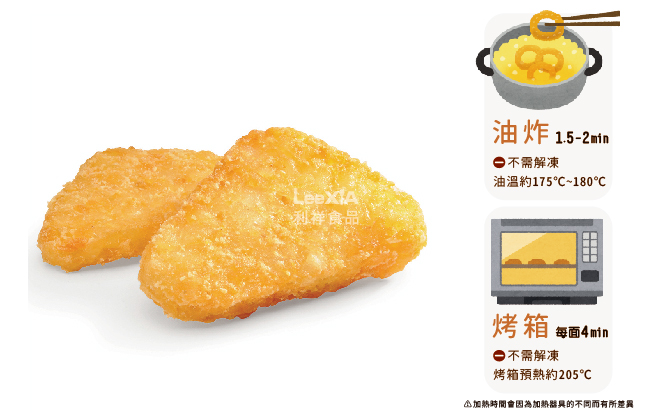 以中火大約180度油炸,炸到有點金黃色時起鍋(約3分鐘),將油瀝乾後即可。撘配番茄醬食用,風味更佳。本產品為冷凍食品.下油鍋時請小心飛濺的熱油 ˙本產品勿須解凍.可直接烹調,不適用微波爐,食用請小心燙口。
