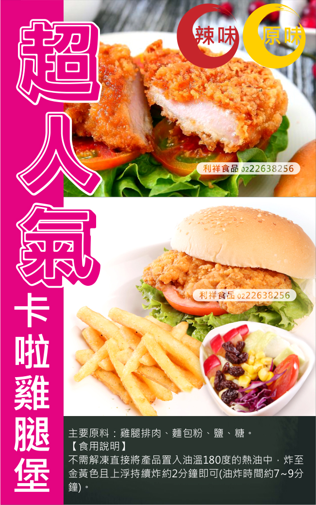 產品簡介:在家就可以作出美味的卡啦雞腿堡,共有原味、辣味二種口味任您選購,喜愛嗆辣酥脆口感的您,可以選擇辣味的唷,吃起來香香辣辣真過癮,再加上些新鮮蔬菜夾上漢堡,就是一款美味又可口的卡啦雞腿堡囉~內層肉鮮多汁包裹著去骨雞腿肉。