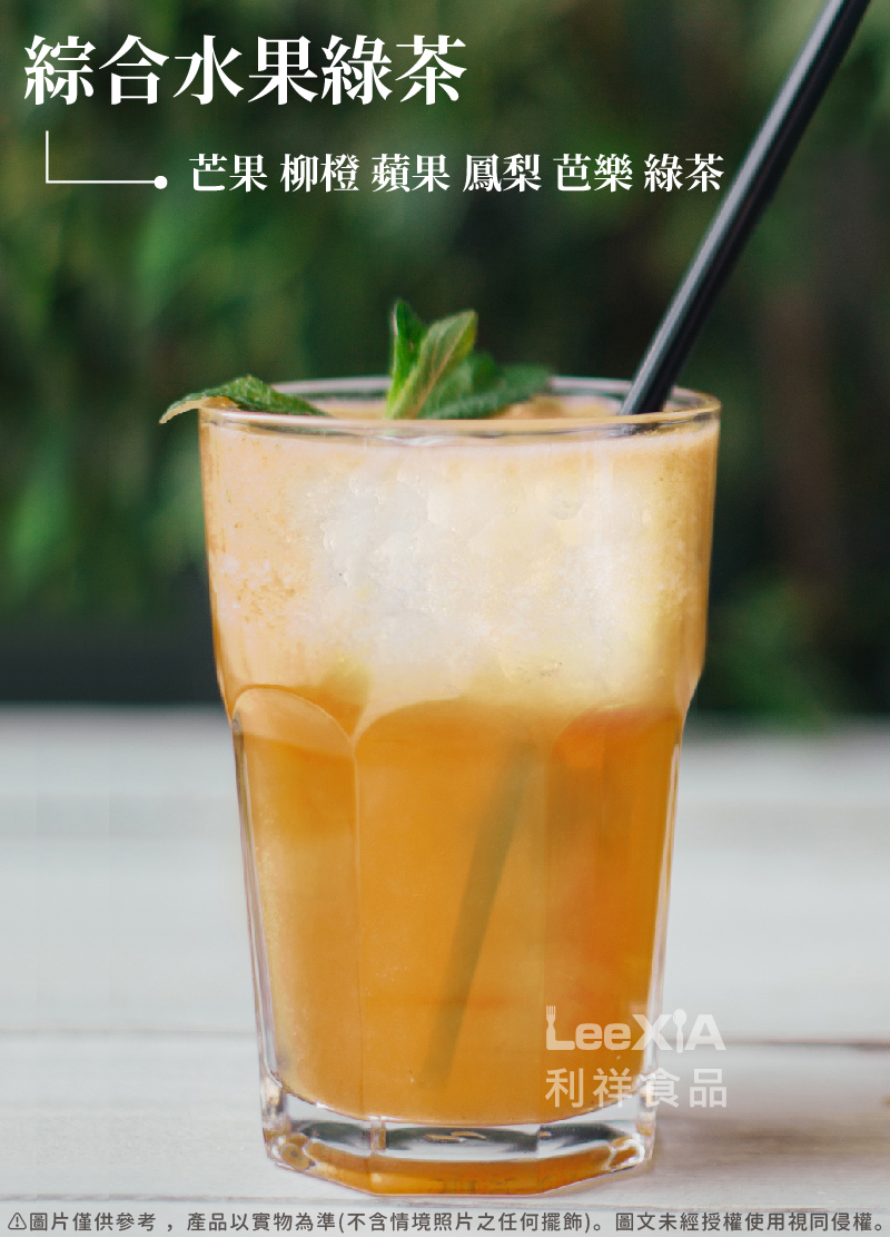 產品簡介:綜合水果綠茶:芒果、柳橙、蘋果、鳳梨、芭樂與綠茶調和成黃金比例! 果漿:水 = 1:6