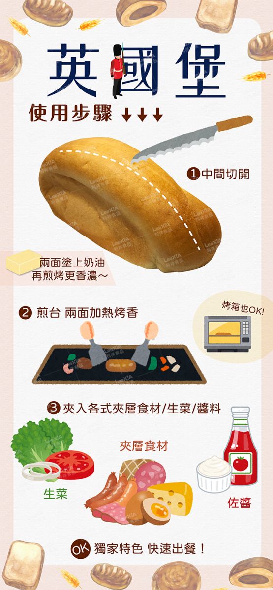 產品簡介:利祥食品2021最新獨家研發! 英國堡麵包香氣濃郁~口感扎實越嚼越香! 堡體兩面推薦使用煎台加熱, 切開一刀夾入各式食材,鹹甜皆宜 出餐效率高!賣相滿分超有飽足感~
