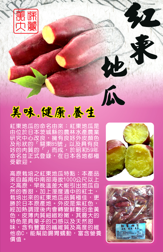 產品簡介:紅東地瓜是日本原生品種屬於高營養蔬菜類,高纖含量、豐富維他命C的地瓜自然香甜,綿密口感好滋味,喜愛自然食品的您不可錯過喔。