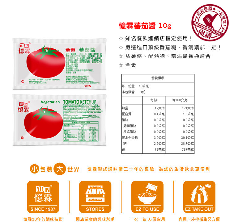 產品簡介:♩♪知名餐飲連鎖店皆指定愛用! 20年的好味道,台灣人最熟悉的滋味,嚴選新疆進口頂級番茄糊,香氣十足!一次一包,好吃的蕃茄醬隨時吃的到~ ►嚴選進口頂級番茄糊,香氣濃郁十足! ►小包包裝,方便又衛生! 適用:沾薯條、配熱狗、蛋餅,沾醬通通適合 ★無添加防腐劑★ 全素