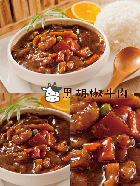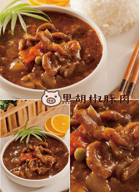 產品簡介:黑胡椒微辣的口味搭配豬/牛肉最對味!經過醃製處理的豬/牛肉保留本身的鮮嫩口感,香濃的醬汁吸足了豬/牛肉的香氣與肉汁,滑順的口感配上米飯一起吃,唇齒留香,還有十足的飽足感!