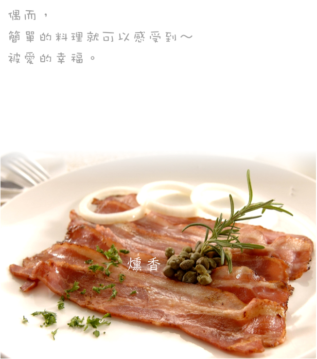 產品簡介:挑選肥瘦適中優質五花肉與調味料醃漬入味,煎、烤、炸皆能創造豐富層次口感,是三明治、義大利麵、美式早午餐、沙拉、創意料理好搭擋。以豐富的香脆口感滿足您對味覺的渴望,在家也能輕鬆擁有餐廳般的好滋味!