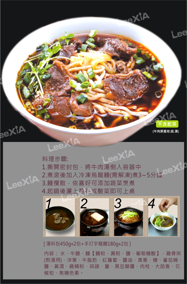 產品簡介:隨時享受一碗比街邊店還好吃的牛肉麵! 湯、肉、麵完美平衡 入口濃郁豐厚。 以數十種中藥材,搭配洋蔥、蔥蒜炒製, 牛肉吸飽炒料的香味,燉後肉質軟嫩適中。 湯頭經過4小時熬煮萃煉出在喉間存留甘甜的口感, 加上吸附湯汁、滲透力強且彈牙的手打宇龍麵, 湯、肉、麵的平衡搭配組合出美味與口感的好滋味! 一口口的暖入饕客的胃!滿足挑剔味蕾的美味料理~ 腱子肉採用美國進口後腱牛肉,屬於常運動的部位。其筋紋呈花狀, 含有高量膠質、帶筋且脂肪也少、口感既有Q勁又多汁,很適合長時間燉煮。 採用黃金小麥製程後急凍保鮮的手打宇龍麵, 不須解凍直接加滾水中烹煮,口感和Q彈不簡單!