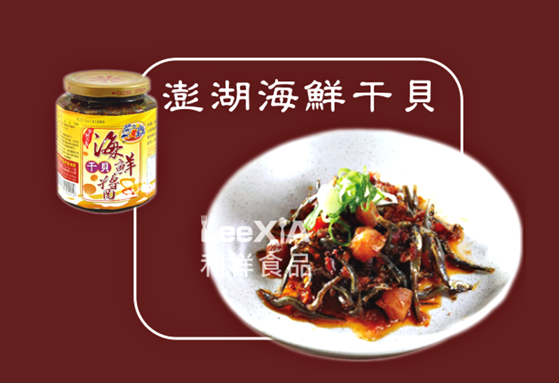 產品簡介:「海鮮干貝醬」是其最受歡迎的醬品,台式口感廣受歡迎, 選用大隻丁香魚和2號干貝、蝦米,配料使用台灣辣椒, 用料慷慨實在,特調的口味香香辣辣讓人一口接一口! 不僅可以拿來當開胃菜, 也非常適合與高麗菜一起熱炒食用,菜香與海洋味混合更是一絕! 不論是下酒、配飯、拌麵條還是拌炒青菜皆適宜!