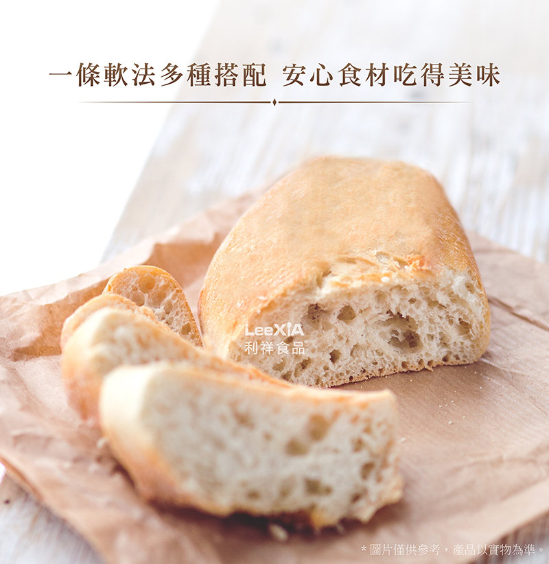 產品簡介:麵包嚴選天然原料食材,無添加任何化學成份,一條軟法多種搭配,安心食材、吃得美味! 正統法國麵包是硬式做法,法國人對此很自豪,而且相當堅持傳統配方,規定只能用麵粉、酵母、水和鹽來製做,沒有任何柔性原料如糖、油、牛奶的緩衝,要做出成功的麵包可不容易。所以口感往往是又乾又硬──其實剛烤好的法國麵包,皮脆心軟,越嚼越香,是冷了才會變硬,而且對法國人來說法國麵包是主食,無論就營養或口味而言,本來就應該越單純越好,冷了硬了都沒關係,沾沾醬汁或濃湯就又香又軟又好吃。在台灣做法國麵包一直都有加少許糖油,這樣真的比較容易成功,反正只加一點點,對原有風味不致於影響太大。法國麵包配方裡的水、油、糖含量,如果再進一步增加,就是軟式法國麵包,仍然又香又有嚼勁,雖然較軟而且可以包餡,卻也沒有甜麵包那麼甜膩,所以近年來頗受歡迎。
